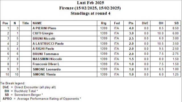 Dopo 4 turni, si aggiudica il primo premio tra i ragazzi Giorgio Ciuti, con 3 punti su 4, mentre il veterano Piero Pierini guida la classifica adulti ed anche assoluta. A tutti va il premio di partecipazione, con l'invito a proseguire l’esperienza!